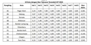 ATAPKOTA, JAKARTA – SETARA Institute telah merilis Laporan Indeks Kota Toleran (IKT) 2024, yang menunjukkan bahwa ada 10 kota di Indonesia yang memiliki skor toleransi terendah. Laporan ini mengevaluasi kinerja kota-kota di Indonesia dalam mengelola keberagaman, toleransi, dan inklusi sosial.