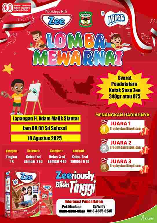 ATAPKOTA.COM, PEMATANGSIANTAR – Dalam rangka menyambut Hari Ulang Tahun (HUT) ke-80 Kemerdekaan Republik Indonesia, Pemerintah Kota (Pemko) Pematangsiantar melalui Badan Kesatuan Bangsa dan Politik (Kesbangpol) akan menggelar Lomba Mewarnai yang dipersembahkan bekerja sama dengan produk susu Zee.