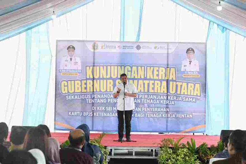 Hal itu disampaikan Bobby Nasution saat melakukan kunjungan kerja sekaligus penandatanganan perjanjian kerja sama pengelolaan tenaga kerja di KEK Sei Mangkei, serta penyerahan kartu BPJS Ketenagakerjaan bagi tenaga kerja rentan, di Kabupaten Simalungun, Kamis (9/10/2025).